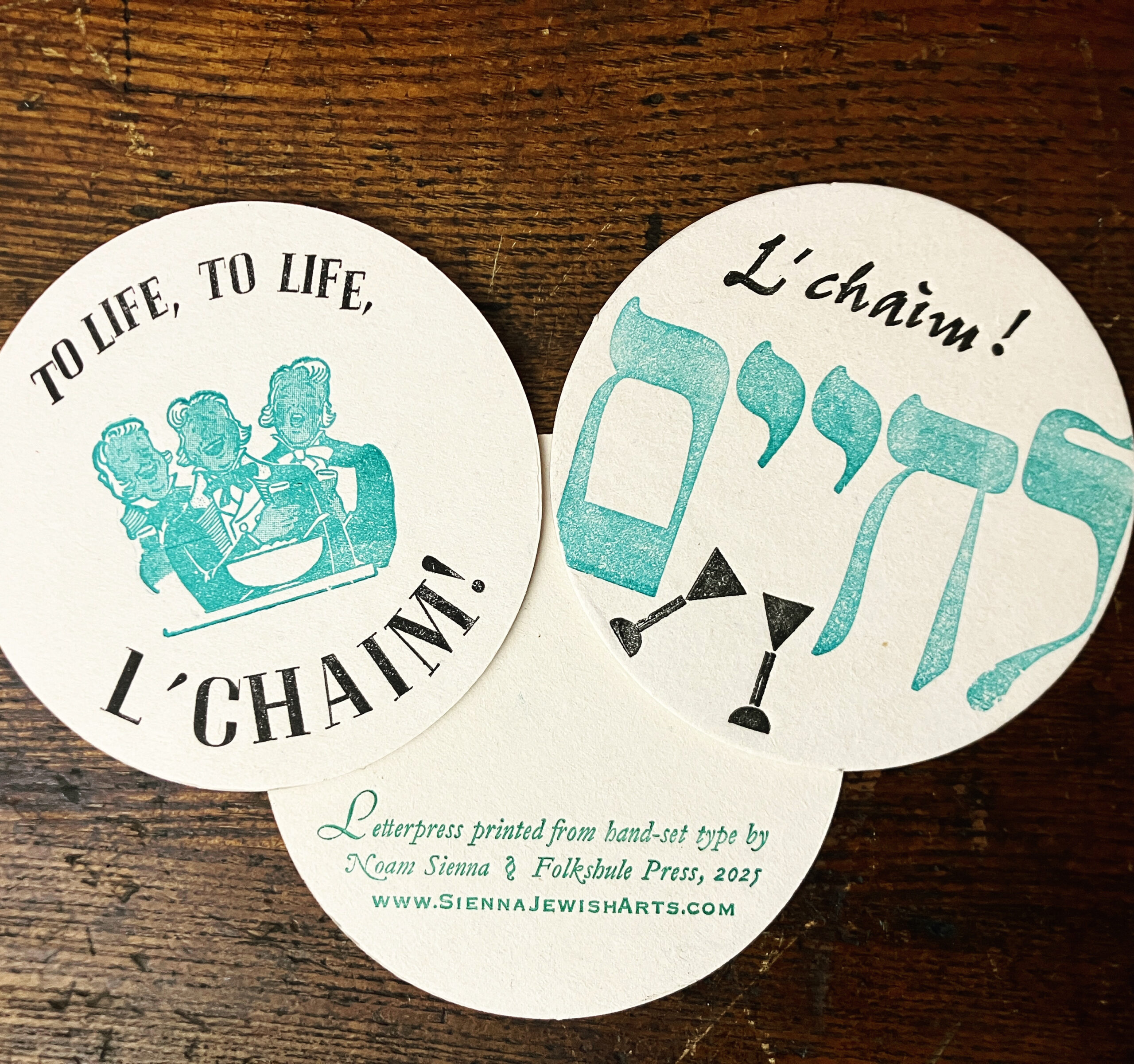 L’chaim! 3″ coasters, on biodegradable pulpboard, sold in packages of 10.